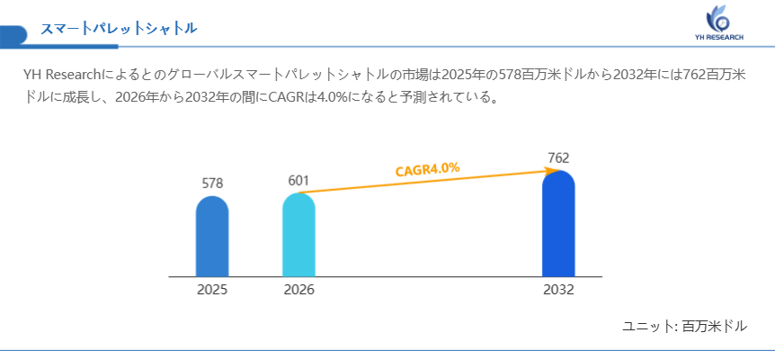 YH Researchによるとのグローバルスマートパレットシャトルの市場は2025年の578百万米ドルから2032年には762百万米ドルに成長し、2026年から2032年の間にCAGRは4.0%になると予測されている。
